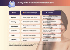 Aqwina Hair Tablet introduces India’s first structured, weekday-wise hair nutrition plan, giving your patients targeted daily support with the right actives, at the right time.